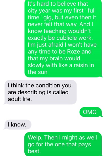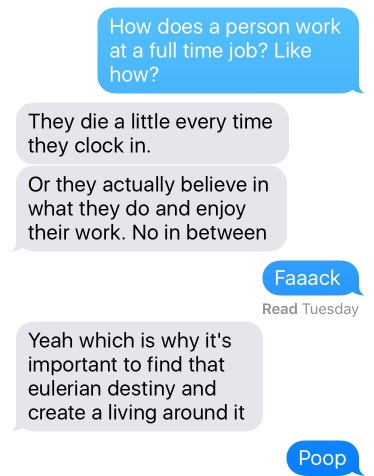 How exactly does one “full time”? It may be my millennial entitlement talking, but why can’t I just be paid to follow my bliss? Punching a clock day in and day out sounds like signing up to be a drooling cubicle slave. It sounds like being chained to a desk while all that I love (and cannot currently afford) is held dangling over a vat of boiling acid(ic debt).