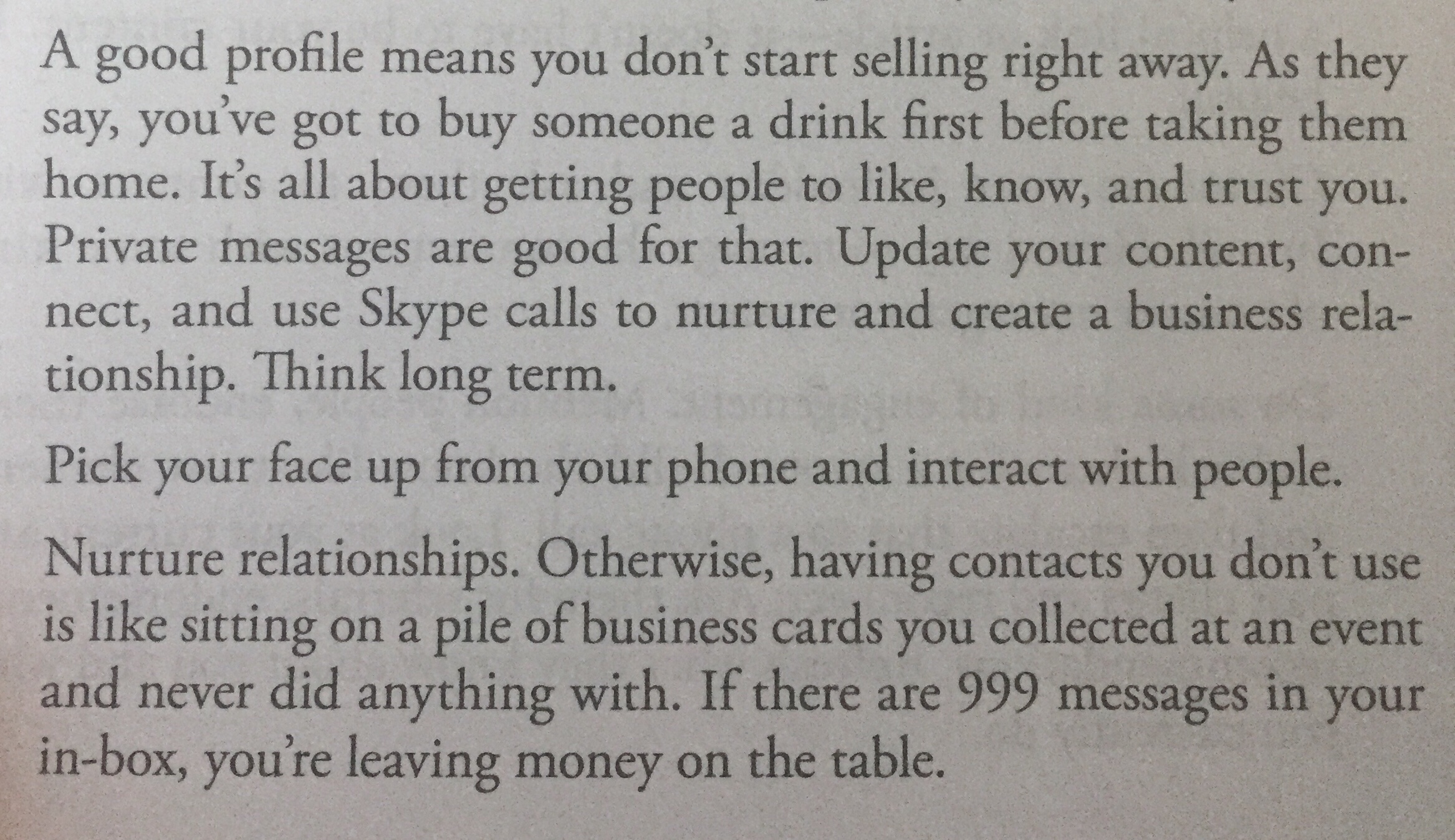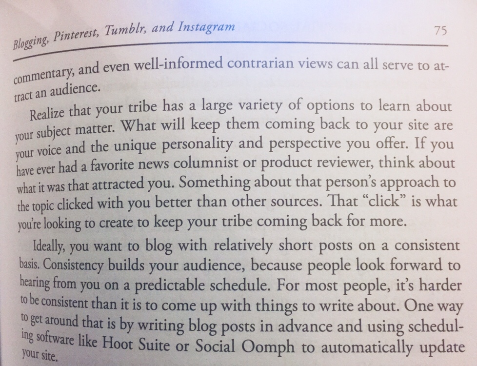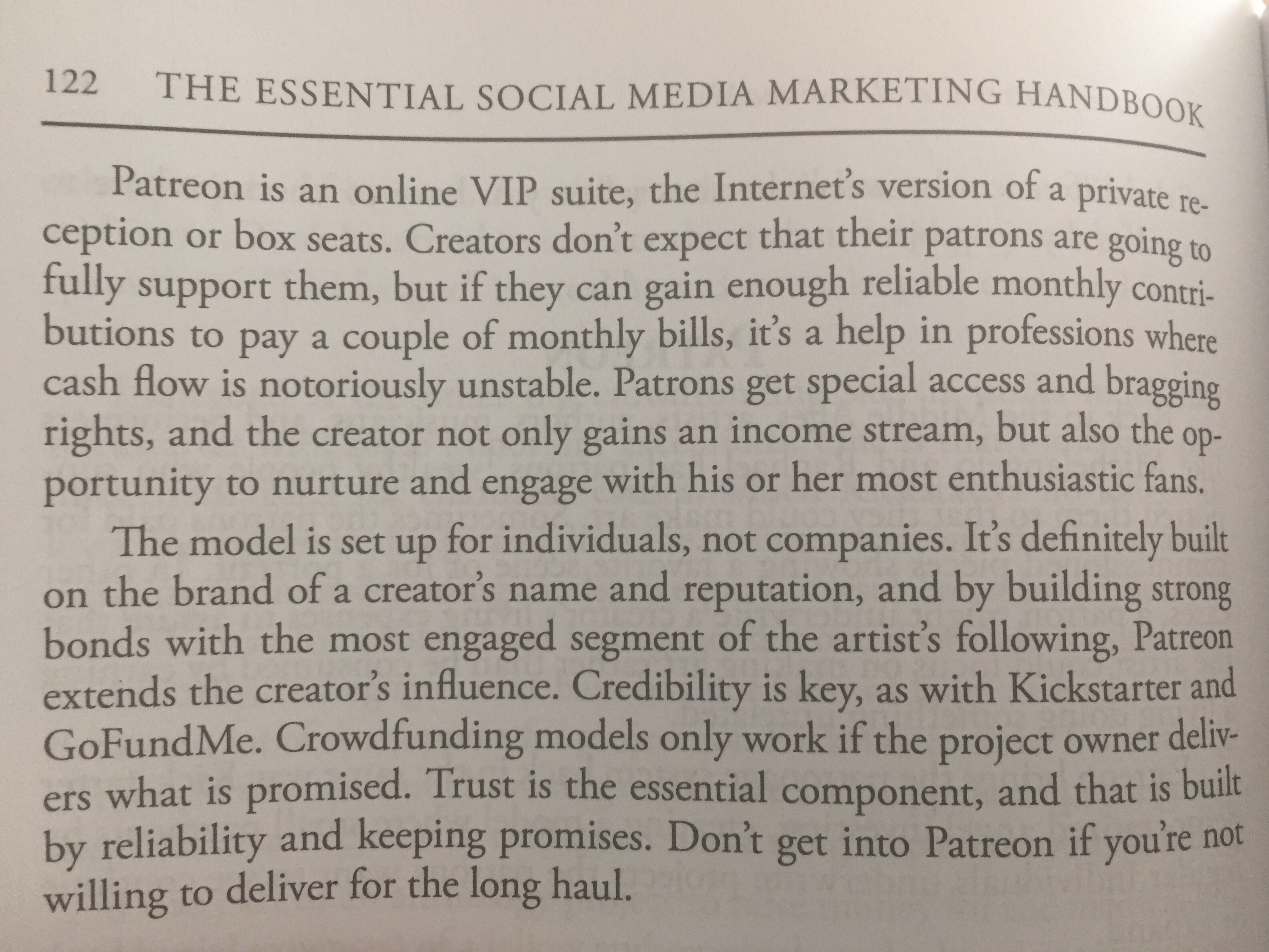 Now this one you can skip ahead to read! Ch. 15 links together all the values, professions, and platforms that may benefit from utilizing SMM. As a creative, SMM is an integral part of networking, collaborating, sharing, and generating revenue. How we use social media has to be both unique and deliberate while creating our brands. Martin spells out clearly which platforms to use for which art forms and how.