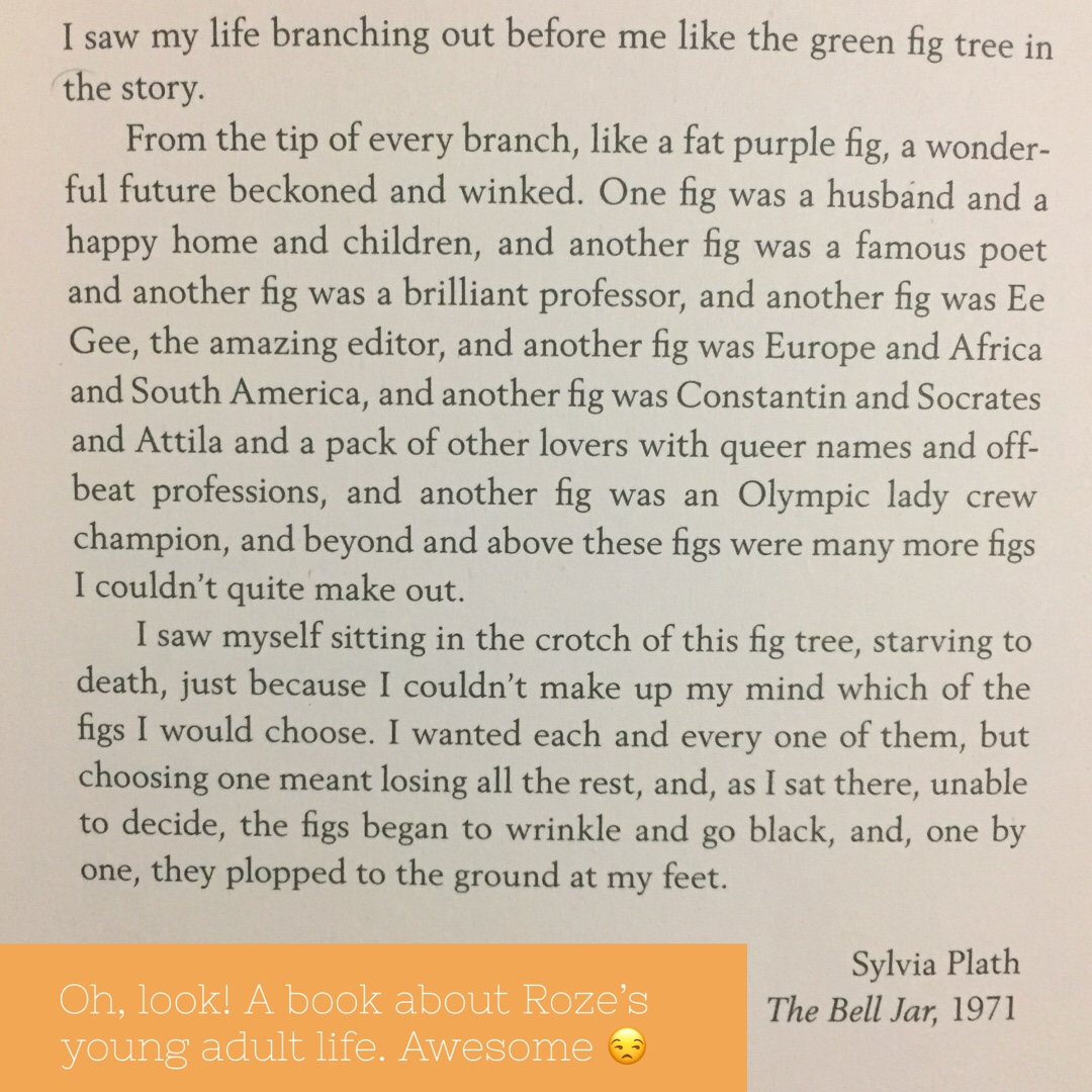 The book opens with an excerpt from “The Bell Jar”, by Sylvia Plath. The colorful depiction of a young woman caught in indecision. The breadth and width of the tree and its many fruit surpassing the undetermined length of her conflicted life. Pursue her passions at the cost of a more comfortable or socially acceptable life? Or travel and eat of the world as the possibilities of marital bliss and motherhood slip away?